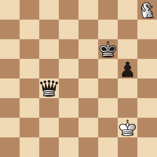 Clearly, White's only chance of winning such a position is to fork the King and Queen. The winning move is therefore clear, White should not check the King towards the Queen but to keep them apart: 1.Ee8+!, White can choose three squares: 1…Kf7, 1…Kf5 are easy to meet with: 2.Ed6+, what is intriguing is that the same winning fork occurs after: 1…Kg6 2.Ed6+!, although 2.Ee5+ is equally good, this remarkable ability to fork on three squares, is what gives this particular example its charm. If from the diagram we remove the g5-pawn and allow, 1…Kg5 2.Ee5+ would be a winner. I put the g5-pawn on the board to show the fork on three squares.