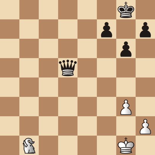 While the Queen is the toast of all beginner players the diagrammed position represents a low blow to her majesty. If White begins with: 1.f8=Q+ Kg2, Black achieves an immediate draw. In fact, in such endings where the defending King escorts a passed pawn to the seventh or second ranks, the Queen has a terrible time against the a, c, f and h-pawns. In Seirawan Chess, the diagram represents a simple win for White. In fact, remarkably enough, White's King isn't needed at all as White forces the win of Black's pawn.