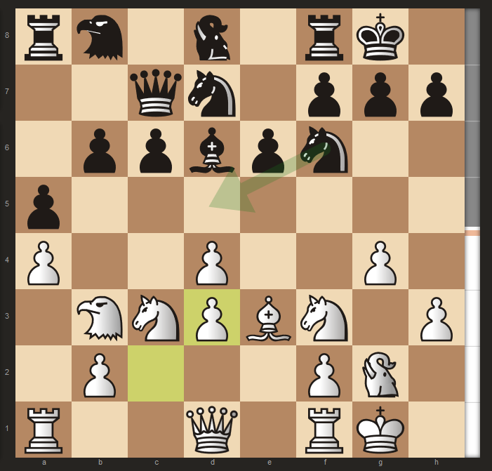 Hardly a forced sequence, but here white has (comparably) easier play, with the hawk already on a good square, and a slight space advantage. White could gate the elephant on e1, whereas it is not totally clear how black will finish their development, as both the hawk and elephant must now be gated on a8, b8, c8, or d8, all of which seem slightly awkward. Black could, of course, play c5 here to open the position, but then it probably makes more sense to do it earlier.