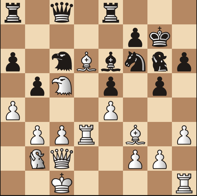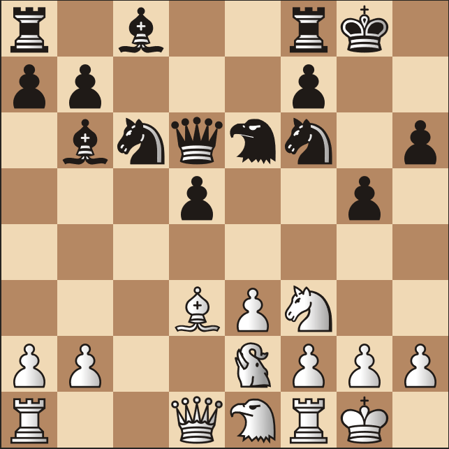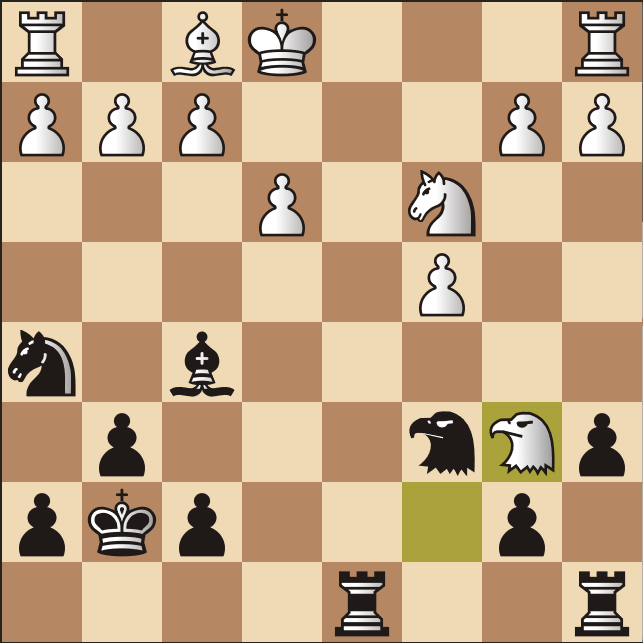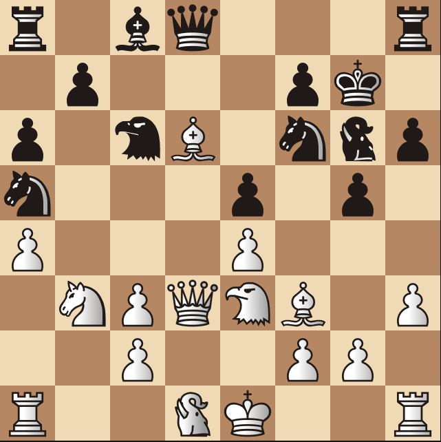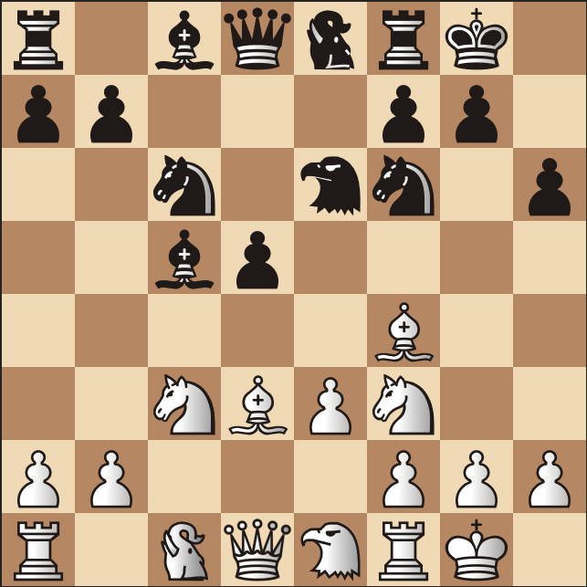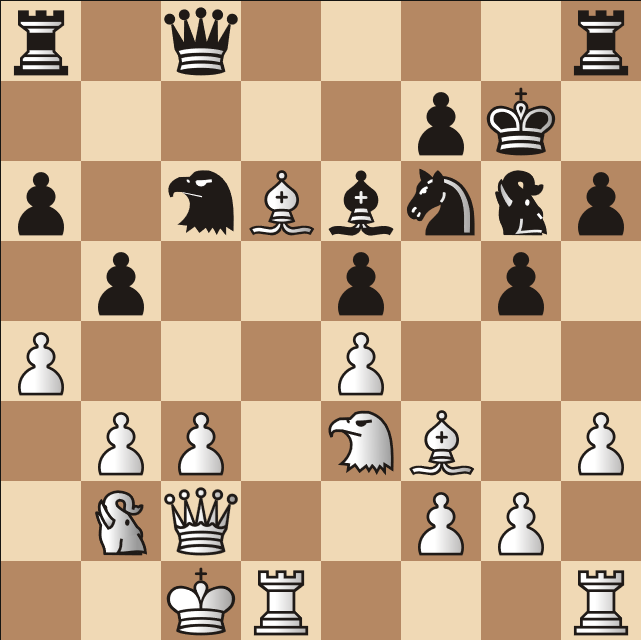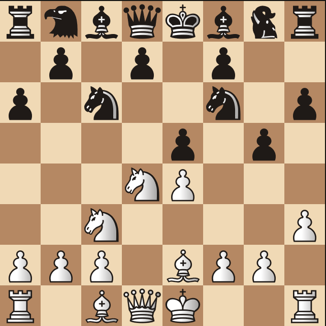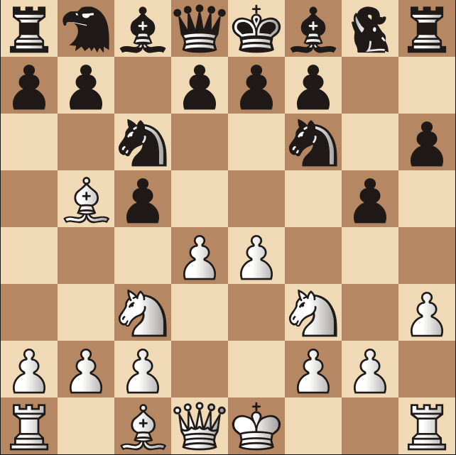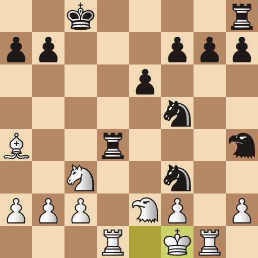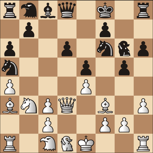 In this position, we see the effect that two additional pieces have on the game. Remarkably, both players have fairly cramped positions. White’s elephant, while not misplaced, hinders the natural Re1. Black, on the other hand, will have a difficult time connecting his pieces, but nonetheless remains solid. In particular, it is difficult to see what Black plans to do with the Hawk, never mind being able to play a move like Rad8 or Rc8 in the future as would be customary in chess.
