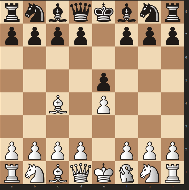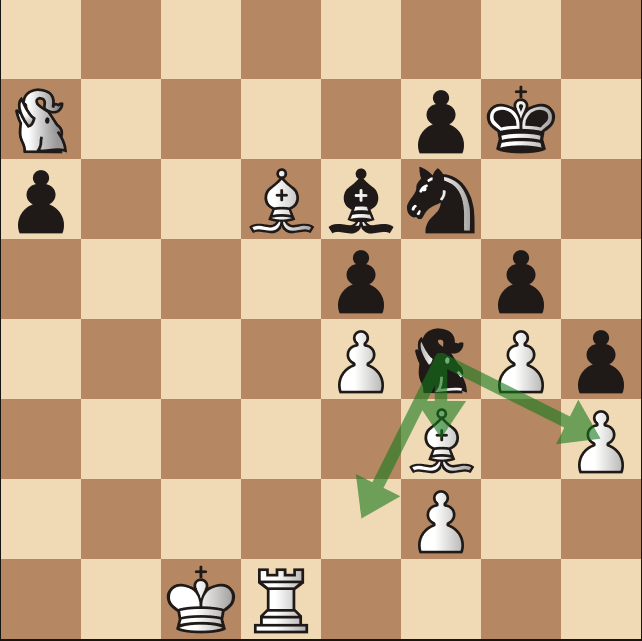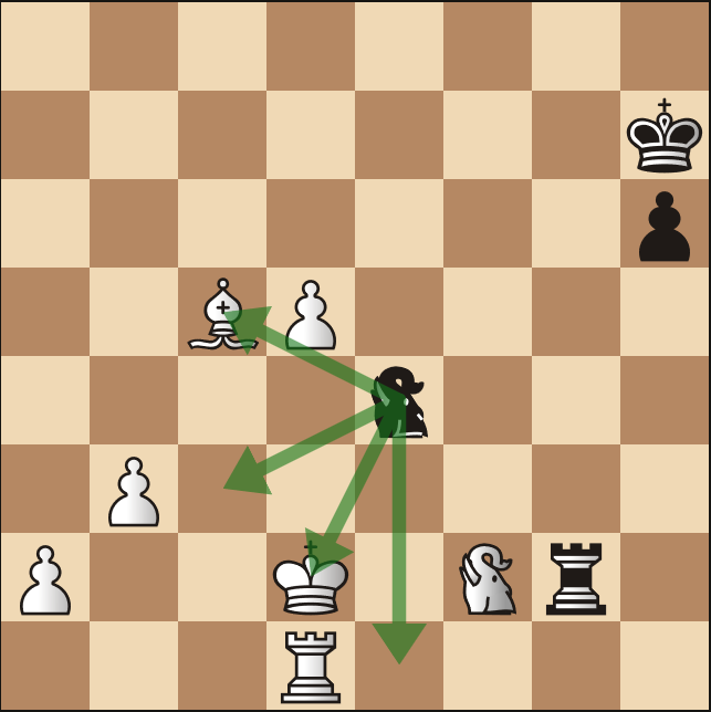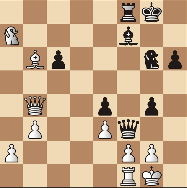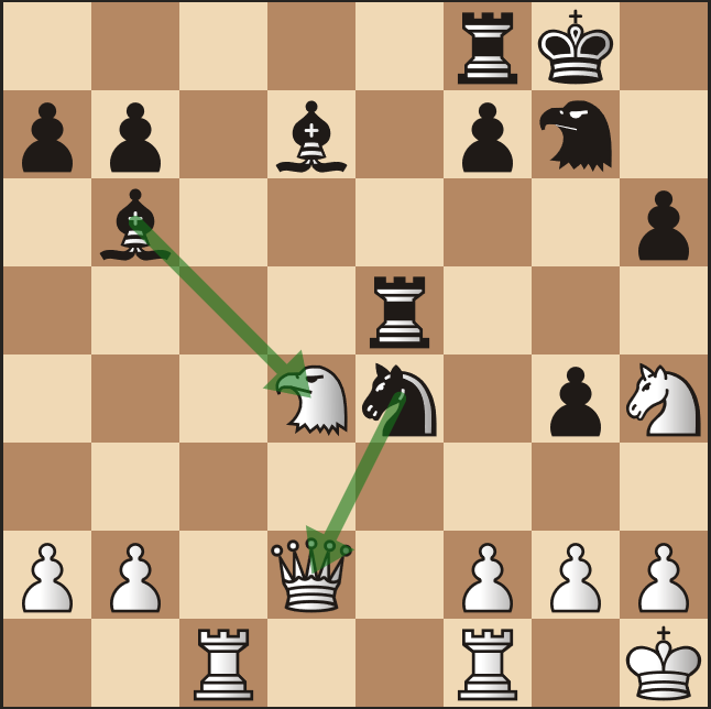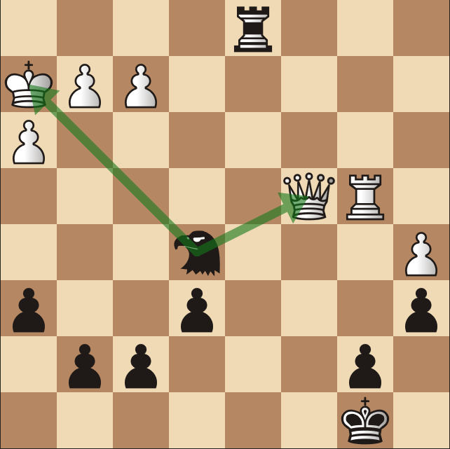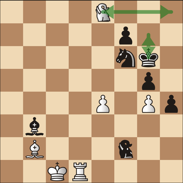 At first sight, this position appears quite good for black, as white’s king is wide open while black’s elephant covers the entry point f8 and the black knight covers e8. However, white has a trick up their sleeve: