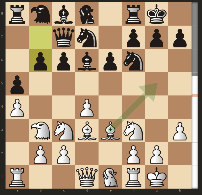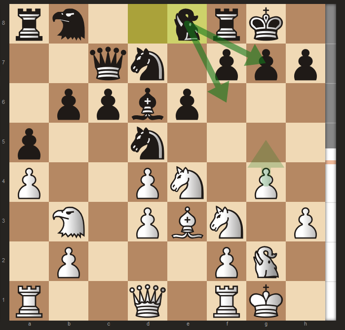 The Hawk, on the other hand, is a tricky piece to gate. If we think of it as a knight-moving piece on the back rank, it does not matter as much where it is gated, as knights normally tend to need several moves to reach an ideal position. Thus, we should think of it more as a bishop-moving piece, and put it on a useful diagonal.