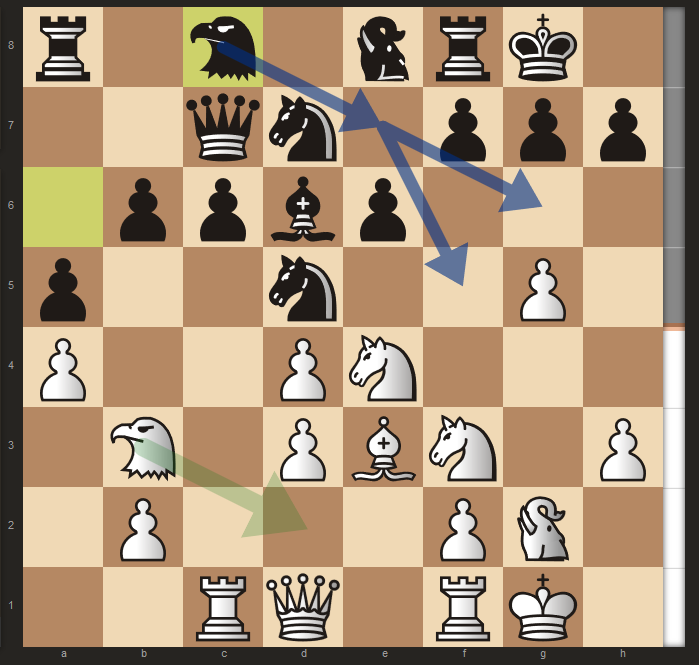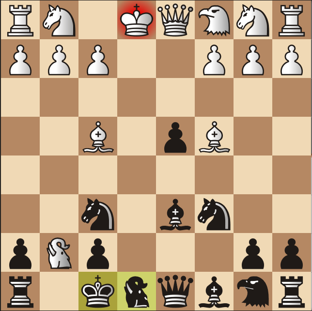 The Hawk and Elephant bring many new tactics to the game, and are especially tricky due to their knight movements. One has to watchout for various forks in every position, as they can be very unexpected. Normally we are used to the queen as a fairly direct attacking piece, but the Hawk and Elephant can launch attacks in highly unexpected manners, because they are combined with the knight.