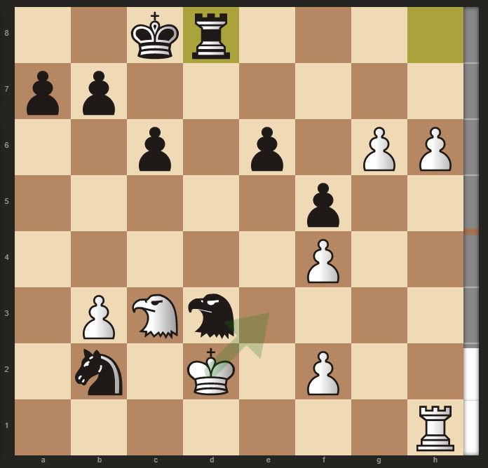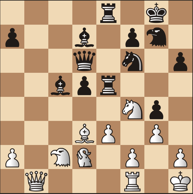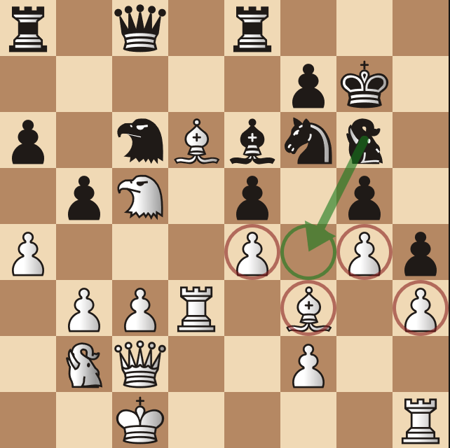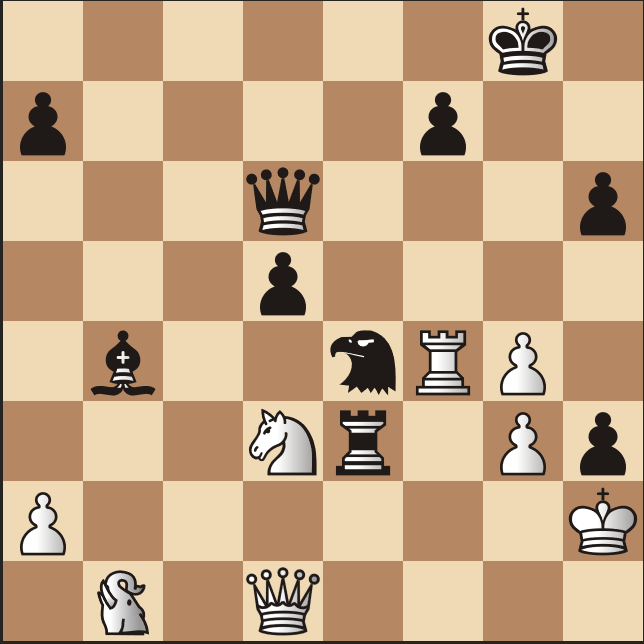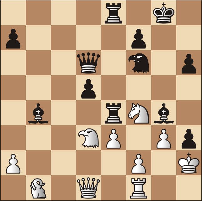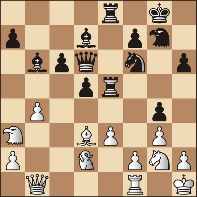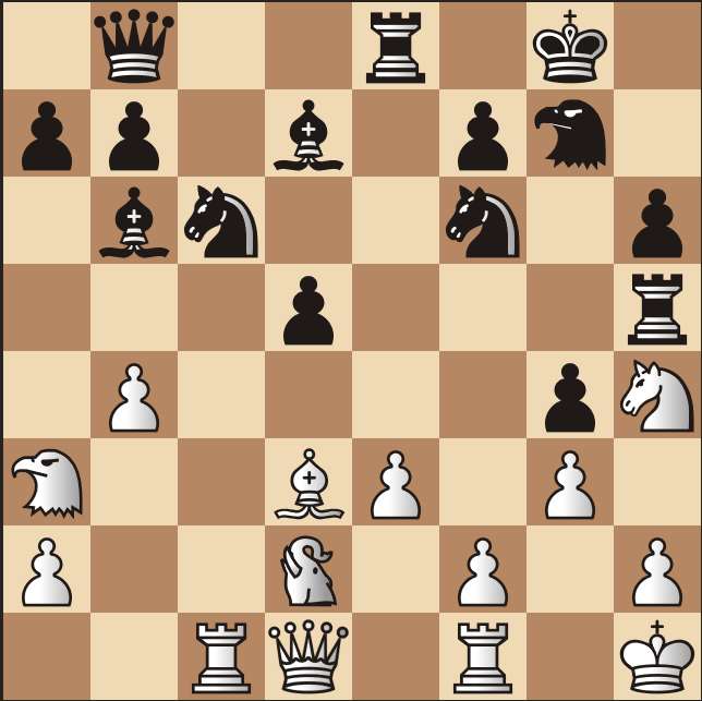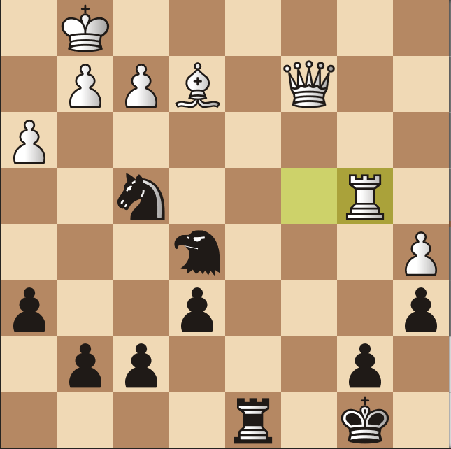 Instead, white chose 29. Hc3??, incorrectly believing that the hawk near the king would somehow protect it from danger. However, after 29…Hd3+ 30. Kd1 Nxb2+ 31. Kd2 Rd8 (more accurate was Hxf4+! when Kc2 Hd3 Kd2 is forced, and black picks up an extra pawn):