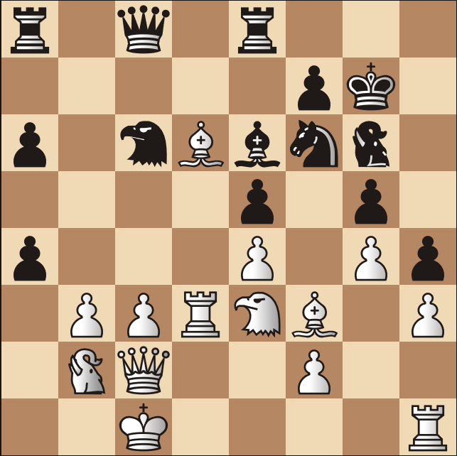 A highly interesting imbalance of two pieces for an elephant has arisen. Although white has traded off two minors, their major pieces still remain cramped without much future. Black’s minor pieces, on the other hand, exert control over the center. Over the next few moves, we will see white’s pieces heavily cramped by black’s forces, so while white shuffles around black steadily improves their position.