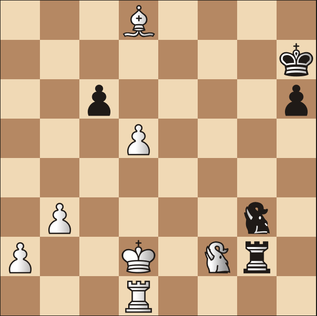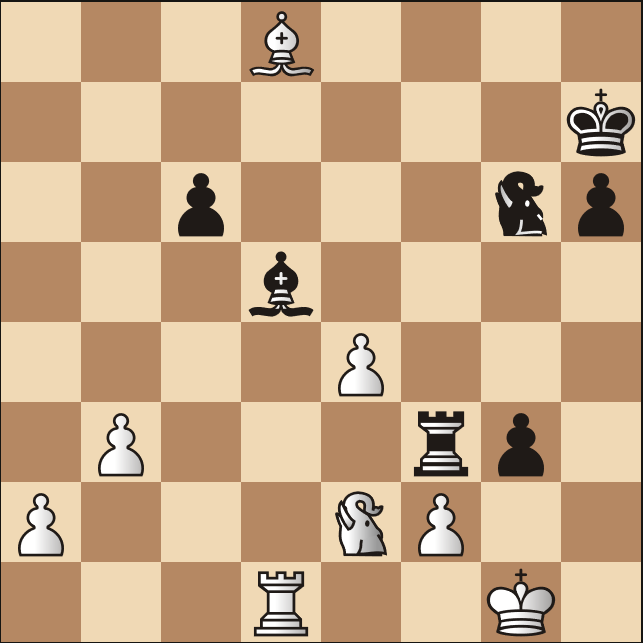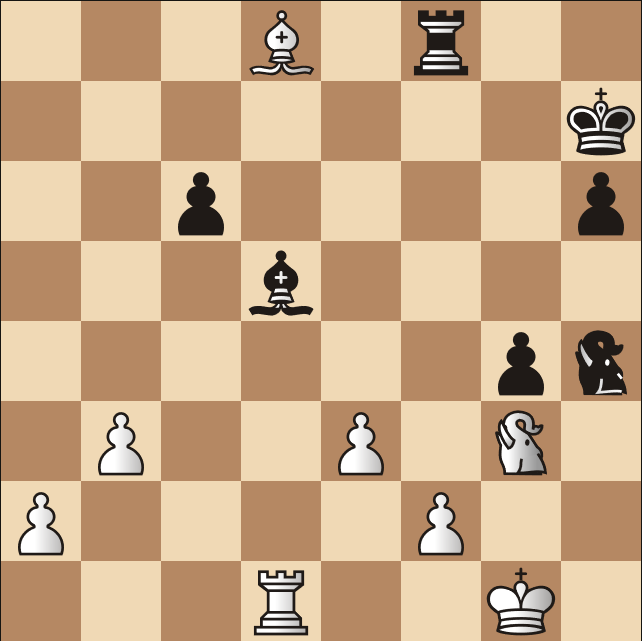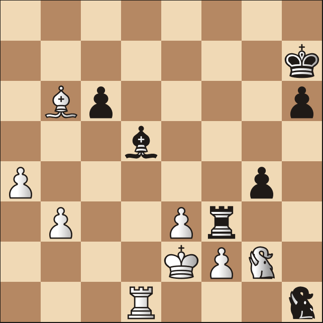 Down an entire rook, black’s elephant, which had been lying dormant since the very beginning, suddenly jumps into play with huge effect. On 38. Bh1?? Ee2 39. Kb1 Ba2 40. Ka1 Ec2 would even lead to mate. White therefore has no choice but to give up the bishop on f3.