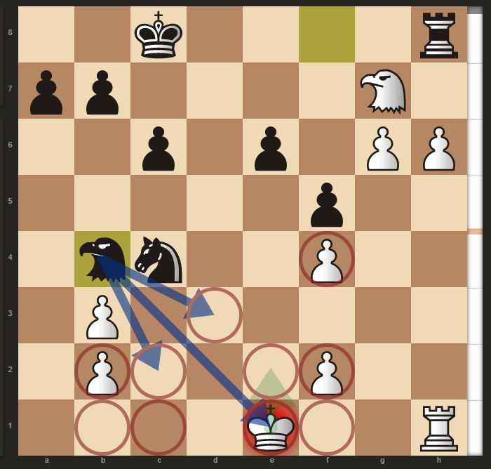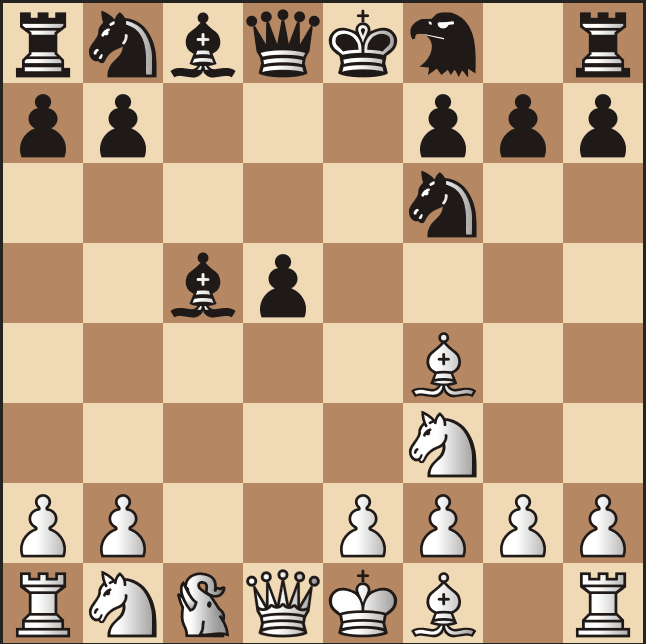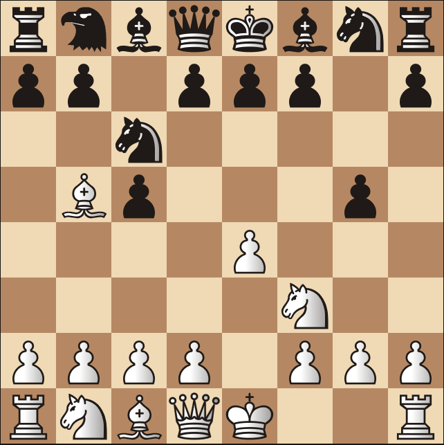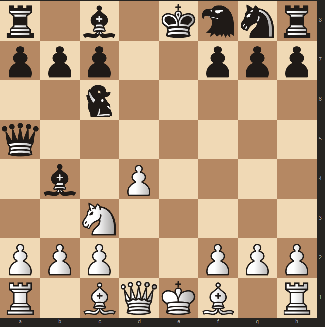 Black has just played 4…Nc6/H, and with normal play the Hawk would be quite useful on b8, controlling the center and potentially staring down on h2. However, white has the strong move 5. Bf4/H! developing a piece with tempo, and posing a question to the hawk. This is not the end of the story, but white already has a significant advantage.