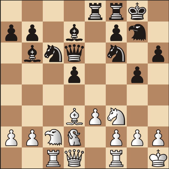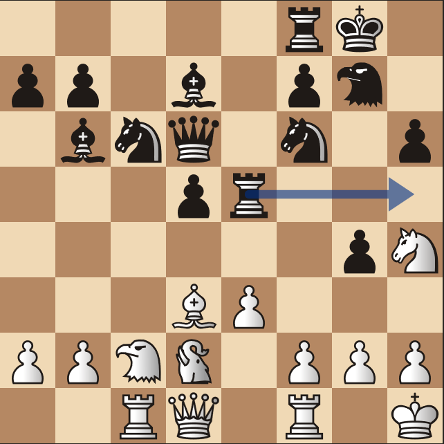 Notice that the pawn on g5 is not really a weakness, because the hawk on g7 cosily defends the black king. With the entire black force developed, it is time to strike: 18…g4! 19. Nh4 Re5