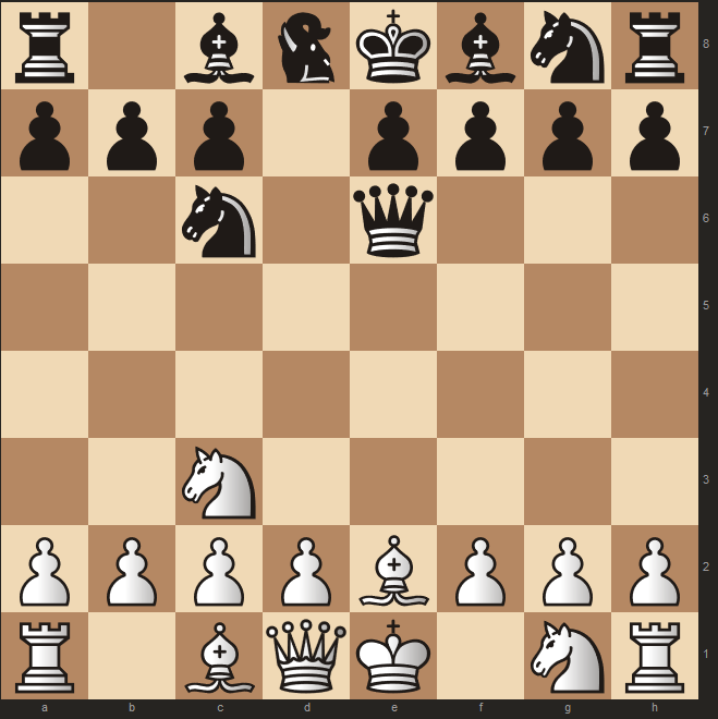 White has gated their elephant on c1, an open file. Black, on the other hand, has good play with a slight space advantage, but will have to spend an additional tempo to castle. In the following moves both sides develop their pieces.