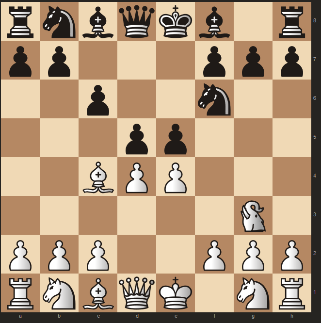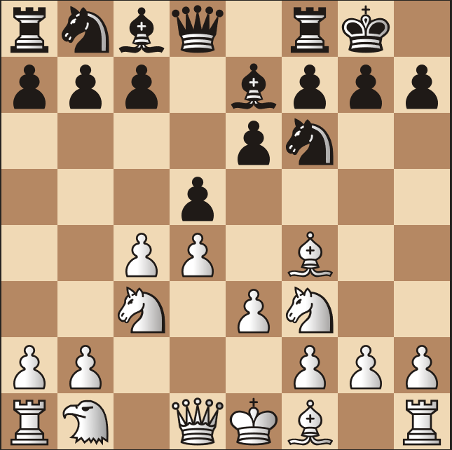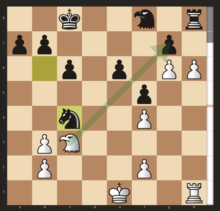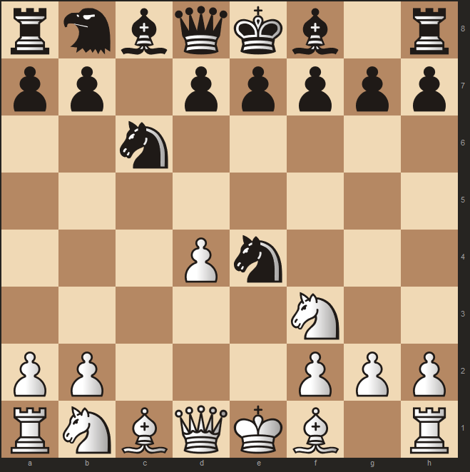 While black has their fun on the kingside, white strikes back in the center. Although this may seem a little strange with the Bb5, it is fully justified due to black’s early g5 push. Nevertheless, black’s control over the center, due to the excellent hawk on b8, ensures the solidity of their position.