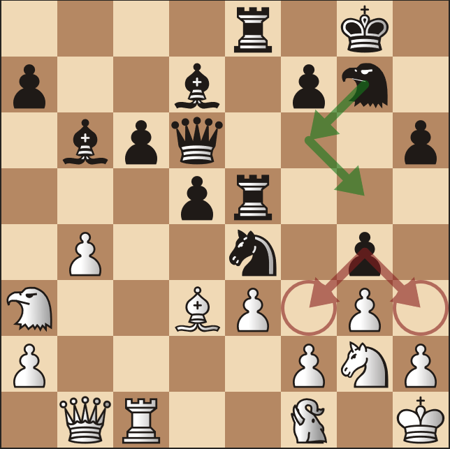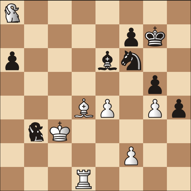 Notice that the Hawk on b4 does not seem that dangerous, as it is only attacking d3 and c2, besides giving a check. However, on d3 it suddenly becomes a force, wreaking havoc on the white king, which suddenly has very limited squares. The key is that after 29. Ke2!! White’s king dominates the hawk, which has no entry into the game. On 29…Rd8 30. Hxe6+ would end the game.