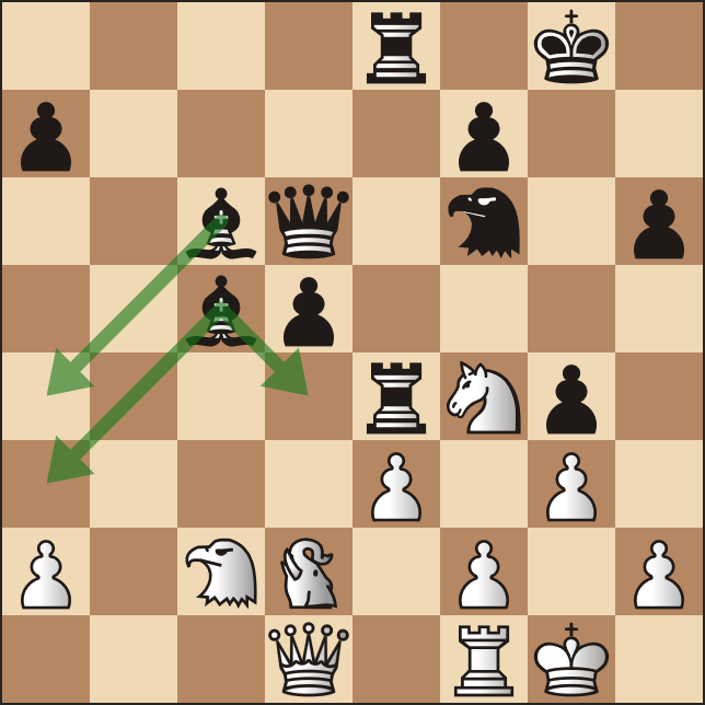 Another basic example of the tricky movement of the elephant/hawk. White has just blundered with 1. h3??. Black has 1…Qxc1+ 2. Qxc1 Ee2, winning an entire elephant.